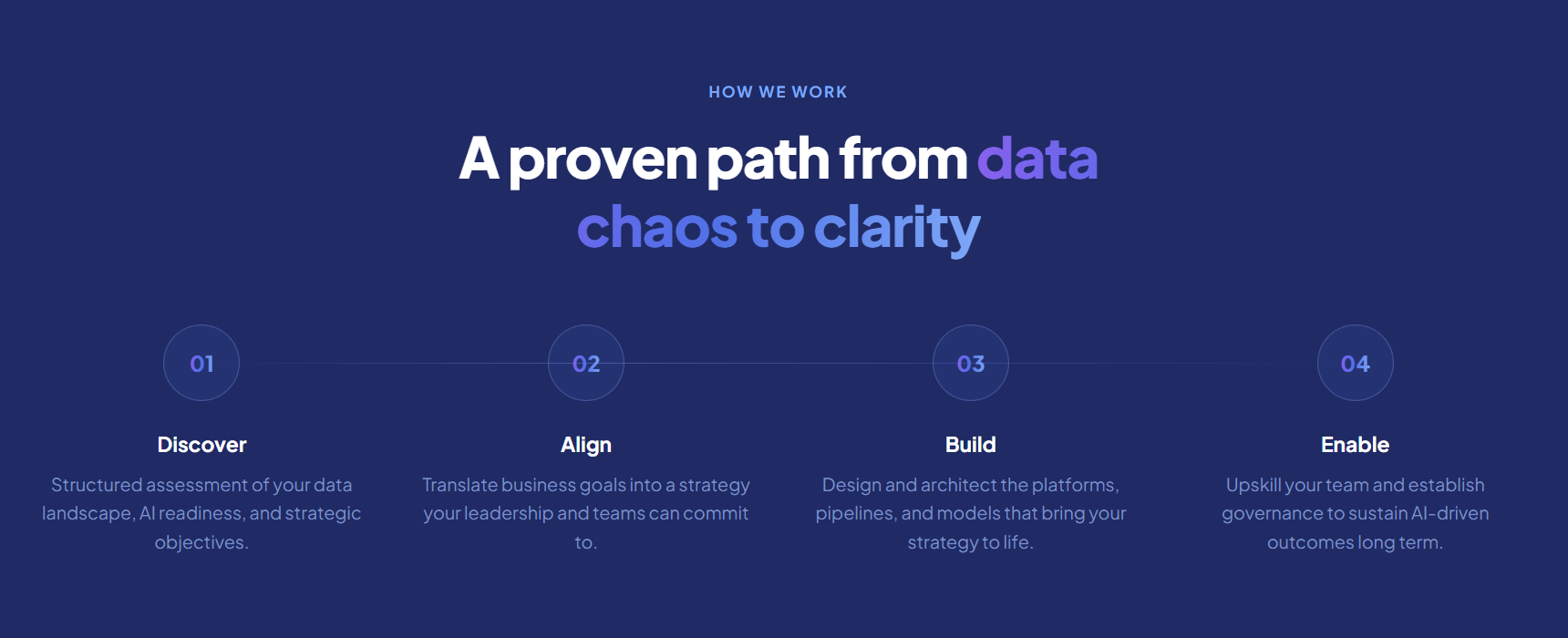 We solve the problem of complexity, mistrust, and misalignment between business goals and technology execution. Our approach transforms scattered data, disconnected teams, and uncertain strategies into cohesive, intelligent ecosystems that power measurable outcomes.